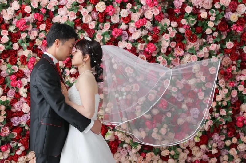 周囲を花でいっぱいに囲まれた写真は、ウェディングならではの特別感が溢れ、お二人の大切な日をより一層彩ってくれたことと思います。