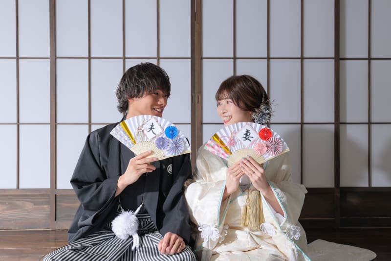 お二人が持ってきてくださった扇子を使って「夫」「妻」の可愛らしいショット!