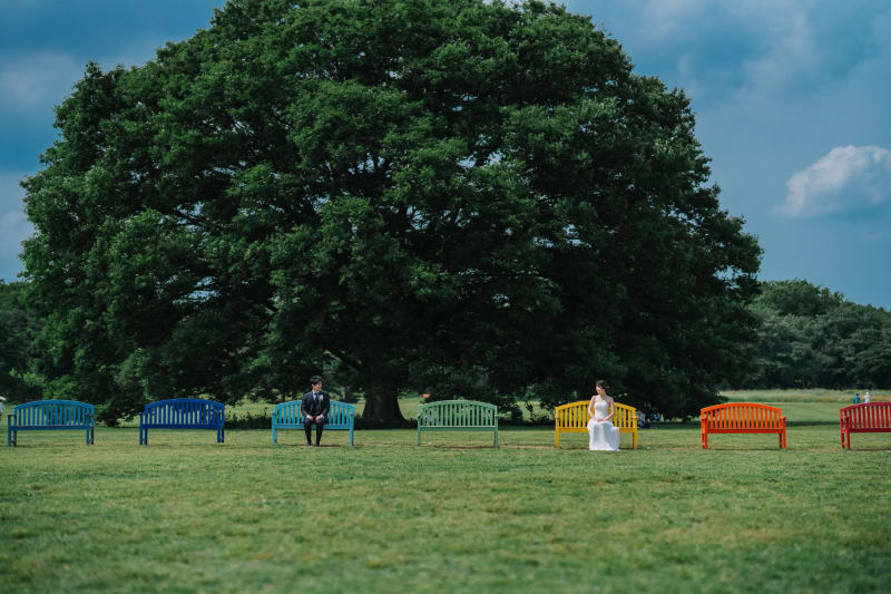最後に、大きな木の前で。カラフルなベンチが緑に映えますね。