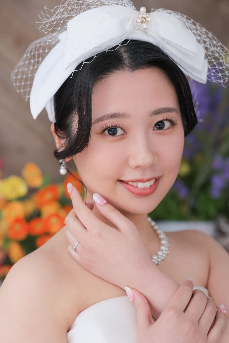 まず、リボンのカチューシャ。これがとても可愛らしく、ご新婦様のあふれる笑顔にピッタリでした。華やかさが加わることで、写真全体に明るさと楽しさがプラスされました。