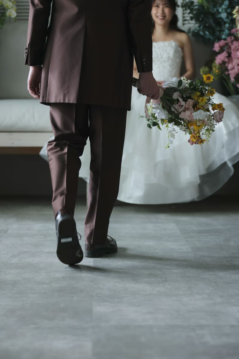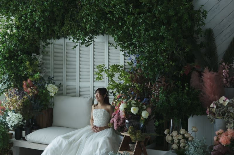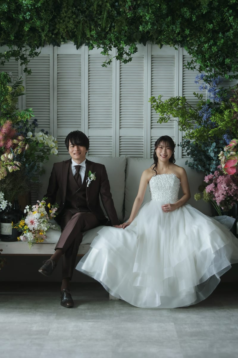 新しくなったスタジオは、ボタニカルな雰囲気で溢れており、その中心にあるソファはまるで物語の中に迷い込んだかのよう。新婦さんはそのソファでとっても嬉しそうに笑っていて、その瞳の先に立っていたのが新郎さんでした。
