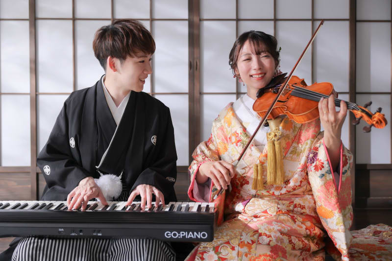 縁側で楽しく演奏♪お二人らしい特別な一枚になりました!