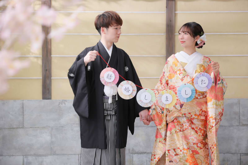 まずはお庭でカラフルなガーランドを使用しました!色鮮やかな色打掛との相性がバッチリです。