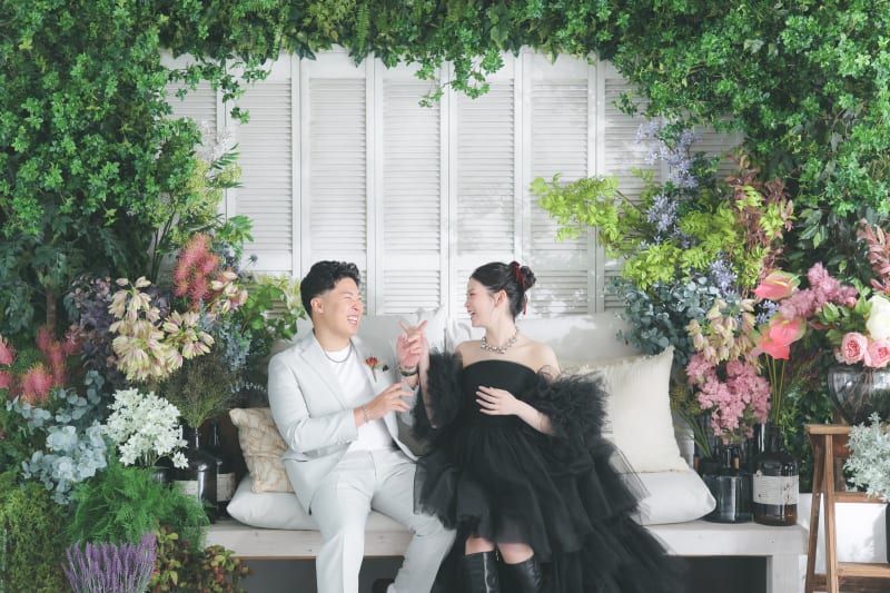 お二人の雰囲気を見つつフラワーウォールやボタニカル背景も使っていき、