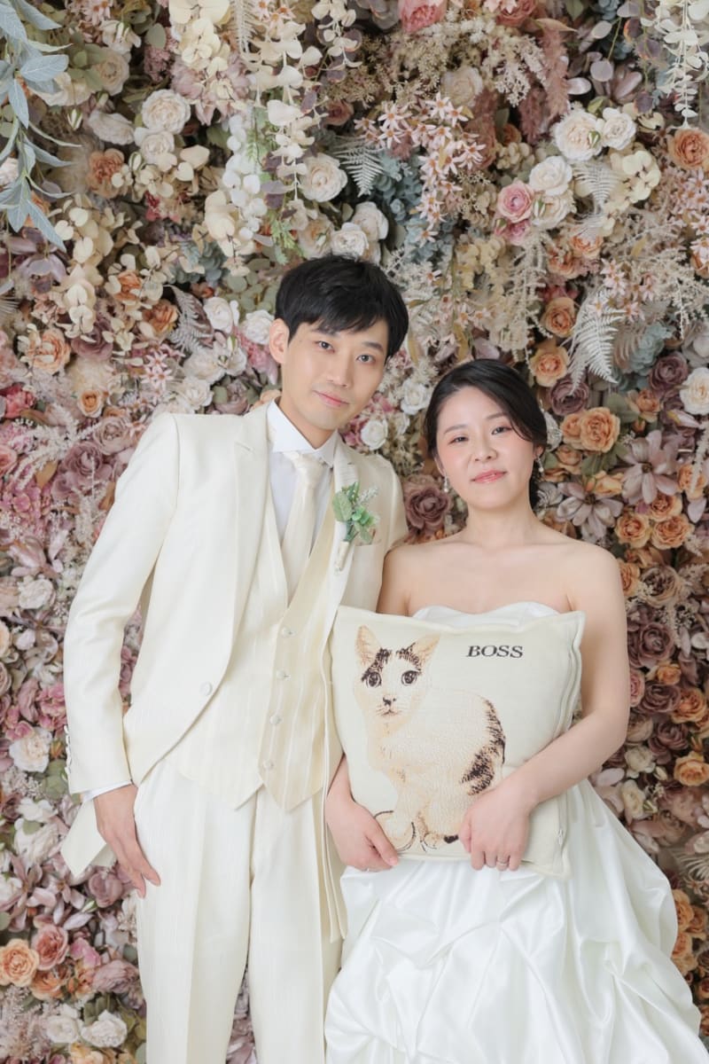 こちらはお持ち込みいただいたお二人の愛猫が印刷されているクッション! クッションを抱いているお二人も可愛らしいです!