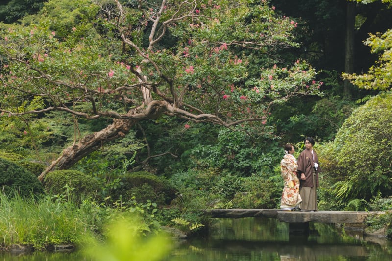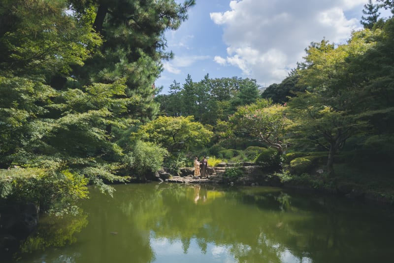 庭園の真ん中には大きな池があり天気のいいに日にはお二人の姿が青空と一緒に反射することもございます。