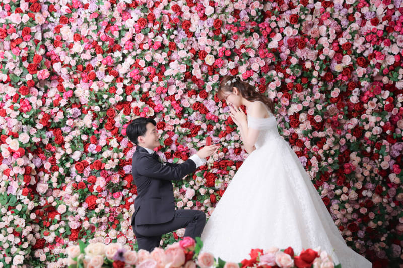 特にバラ背景では、新郎が持ち込まれた婚約指輪、結婚指輪とケースを使いプロポーズシーンを再現。まるで映画のワンシーンのような、心温まる瞬間を撮影することができました。