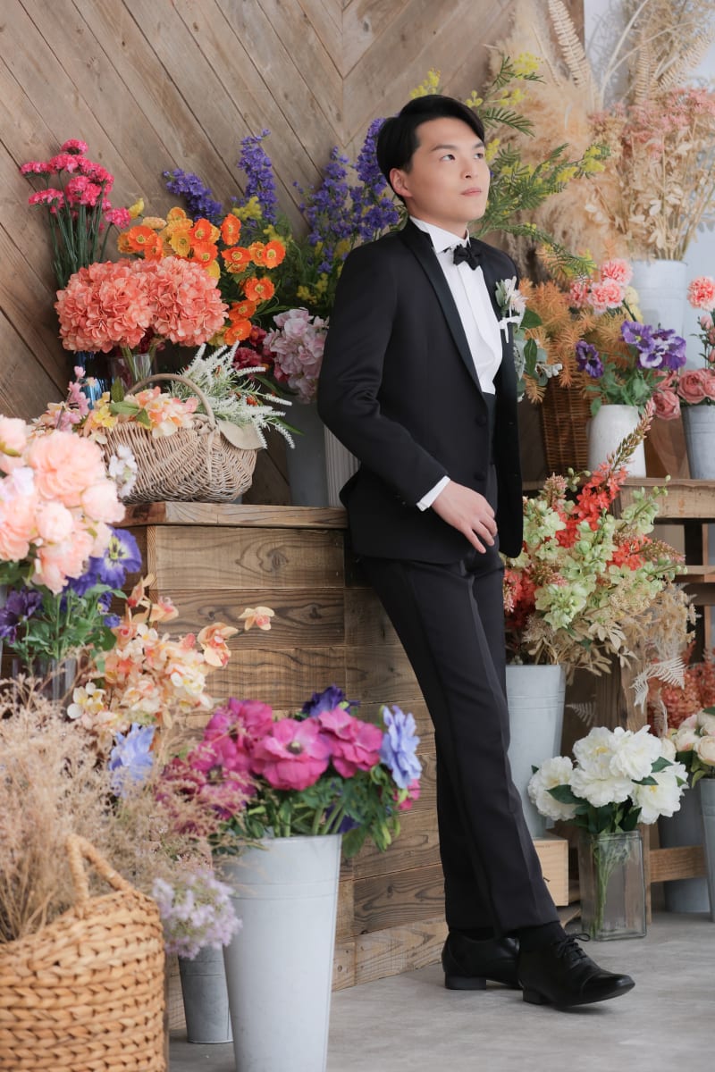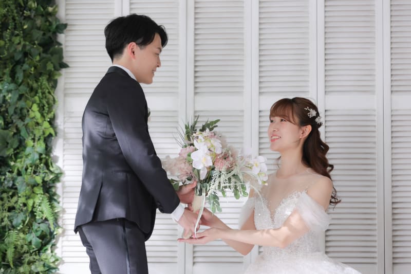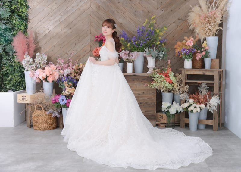 続いて洋装では、華やかな花々を背景に、かわいらしい雰囲気を引き立てる写真を撮影。