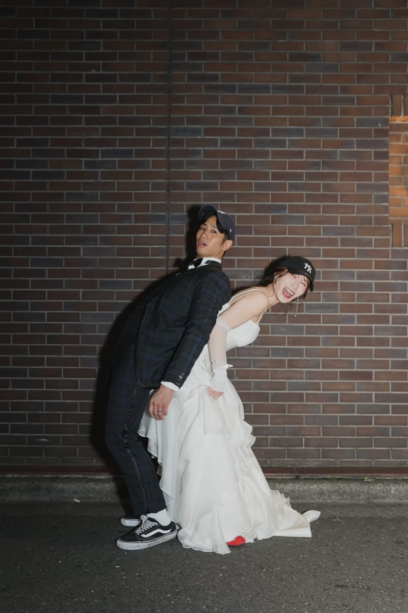 新婦様と新郎様は、お揃いのキャップとお気に入りのスニーカーを身につけ、カジュアルながらもスタイリッシュな装いのおしゃれな一枚に。