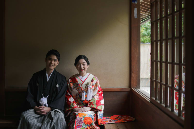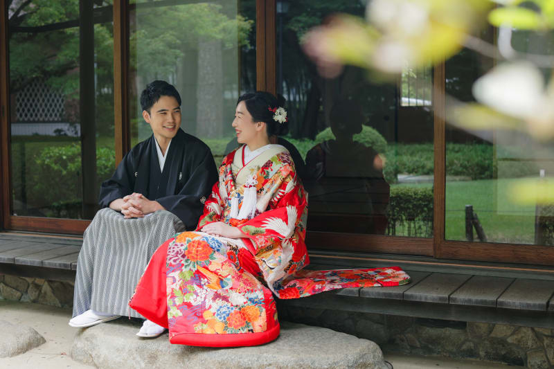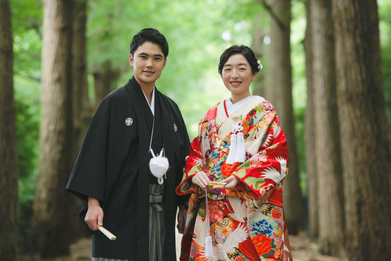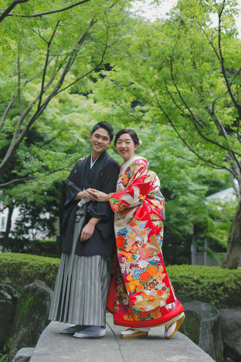 お衣装もとても素敵で、特に新婦様の赤い色打掛が緑の中でひときわ美しく映えていました。お二人の落ち着いた雰囲気は、大田黒公園の厳かな空気感にもぴったりとマッチしており、その調和が写真にもよく表れていました。