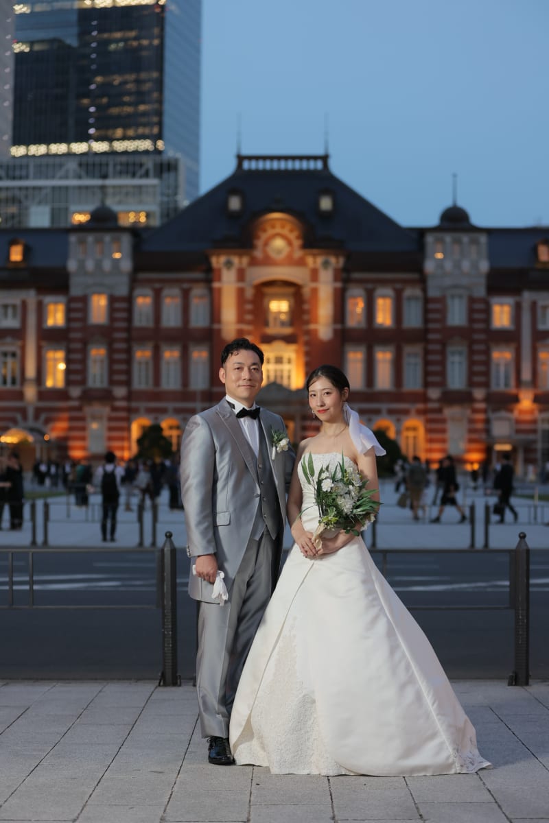 日中とはまた違う趣で、幻想的な雰囲気を醸し出す東京駅を背景に、映画のワンシーンのような瞬間を切り取りました。