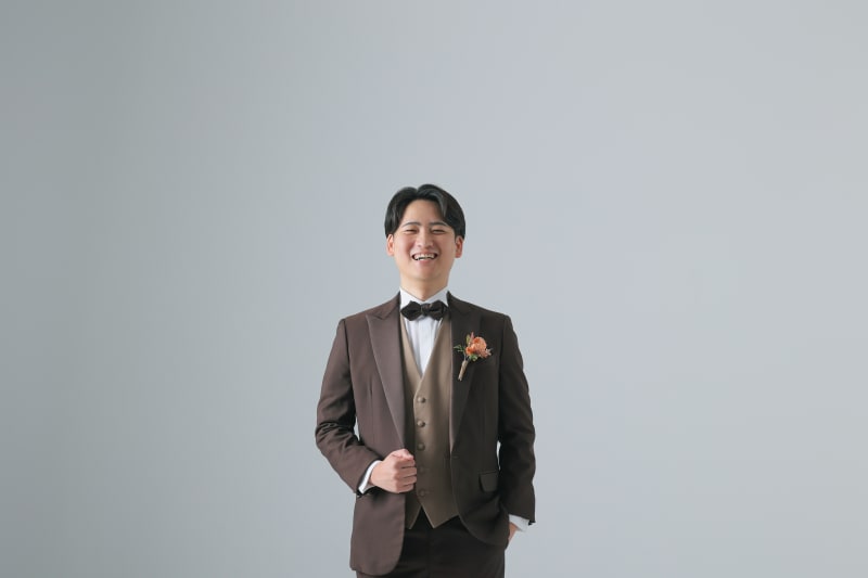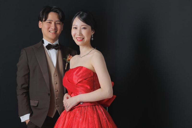 新婦様は印象的な赤いドレスをお召しになり、その華やかさが非常によくお似合いでした。新郎様はブラウンのタキシードを身にまとい、その柔らかい雰囲気にピッタリとマッチしていました。おふたりの衣装の選択は、それぞれの個性と魅力をさらに引き立てていました。
