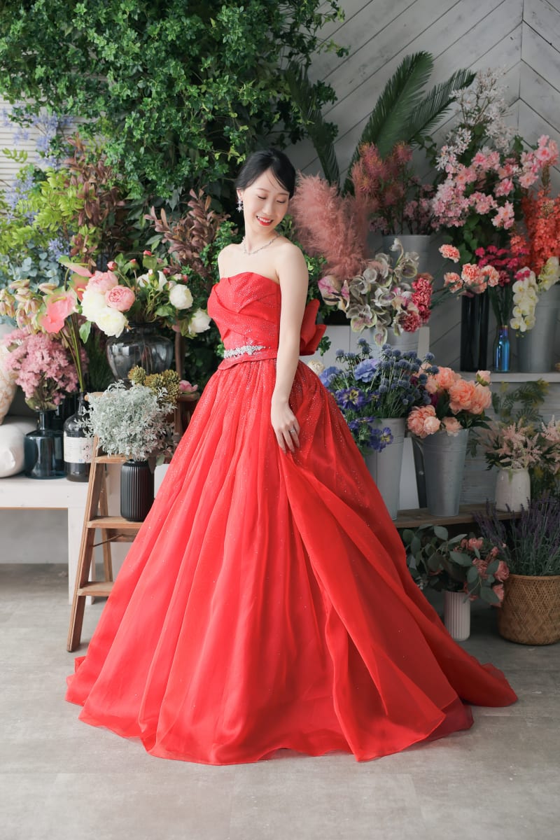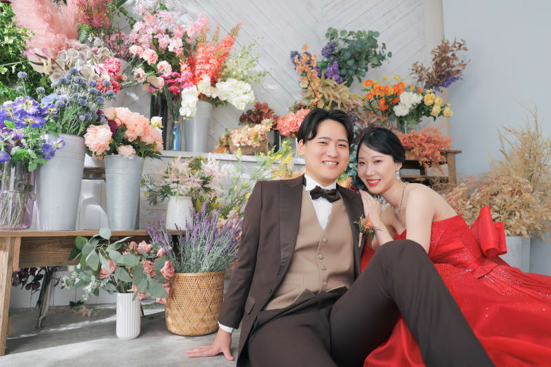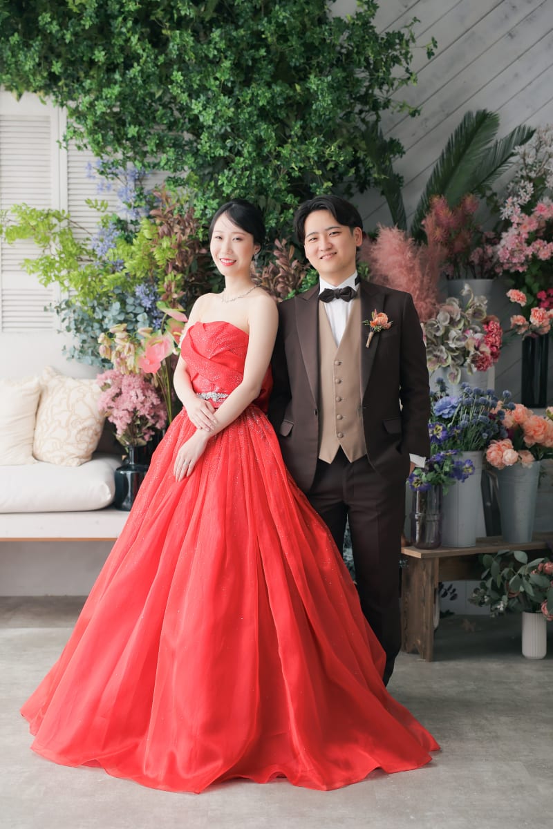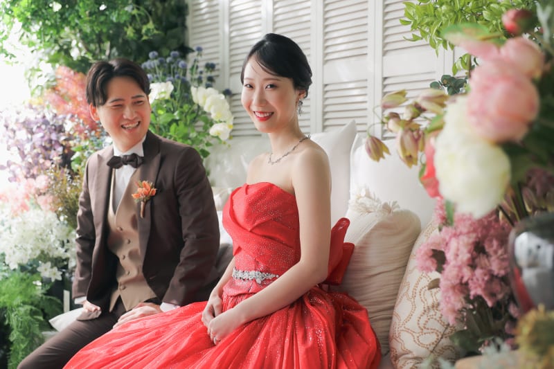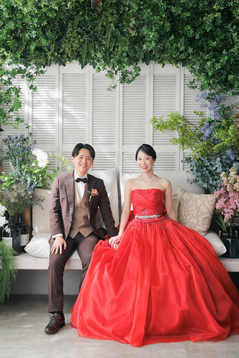 撮影はスタジオのボタニカルな背景を使い、森の中にいるかのような雰囲気の中で進められました。赤いドレスが緑の中で映える様子は、まるで絵画のようでした。そして、仲良く座ったおふたりの自然体な姿をしっかりとカメラに収めることができました。