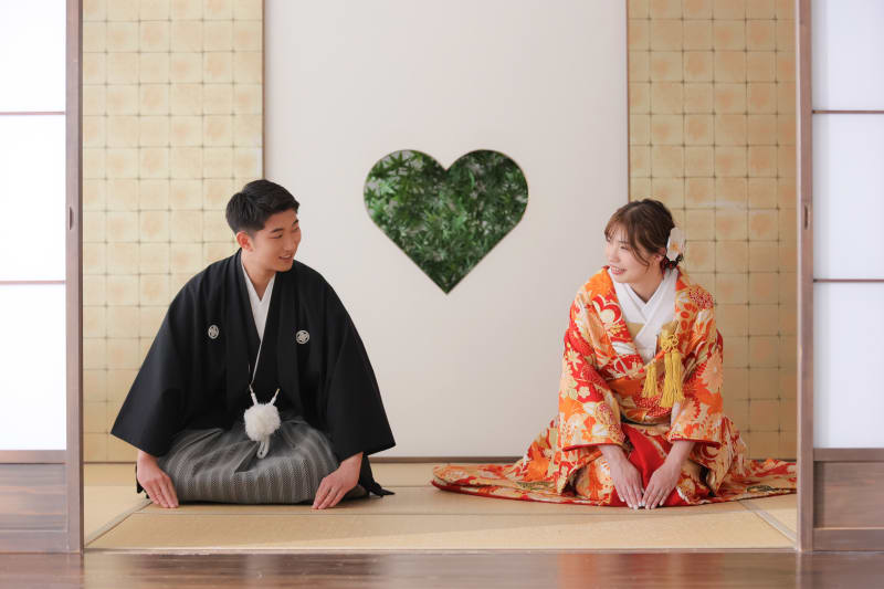 まず、屋内庭園スタジオでの色打掛撮影では、緑が映える背景と共にお二人らしいリラックスした表情を捉え、まるで日本庭園にいるかのような豊かな雰囲気を演出しました。