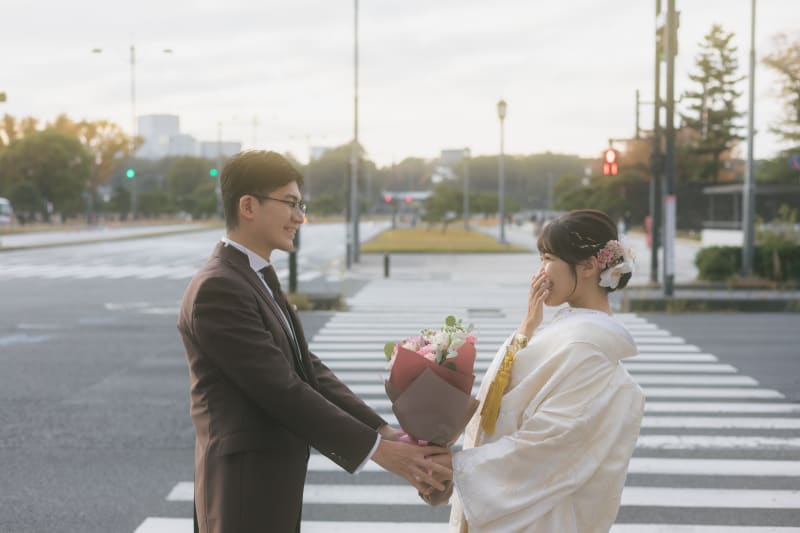本日は東京駅で撮影したご新婦様白無垢&ご新郎様タキシードを着用してのロケーションフォトのお写真をご紹介してまいります◎