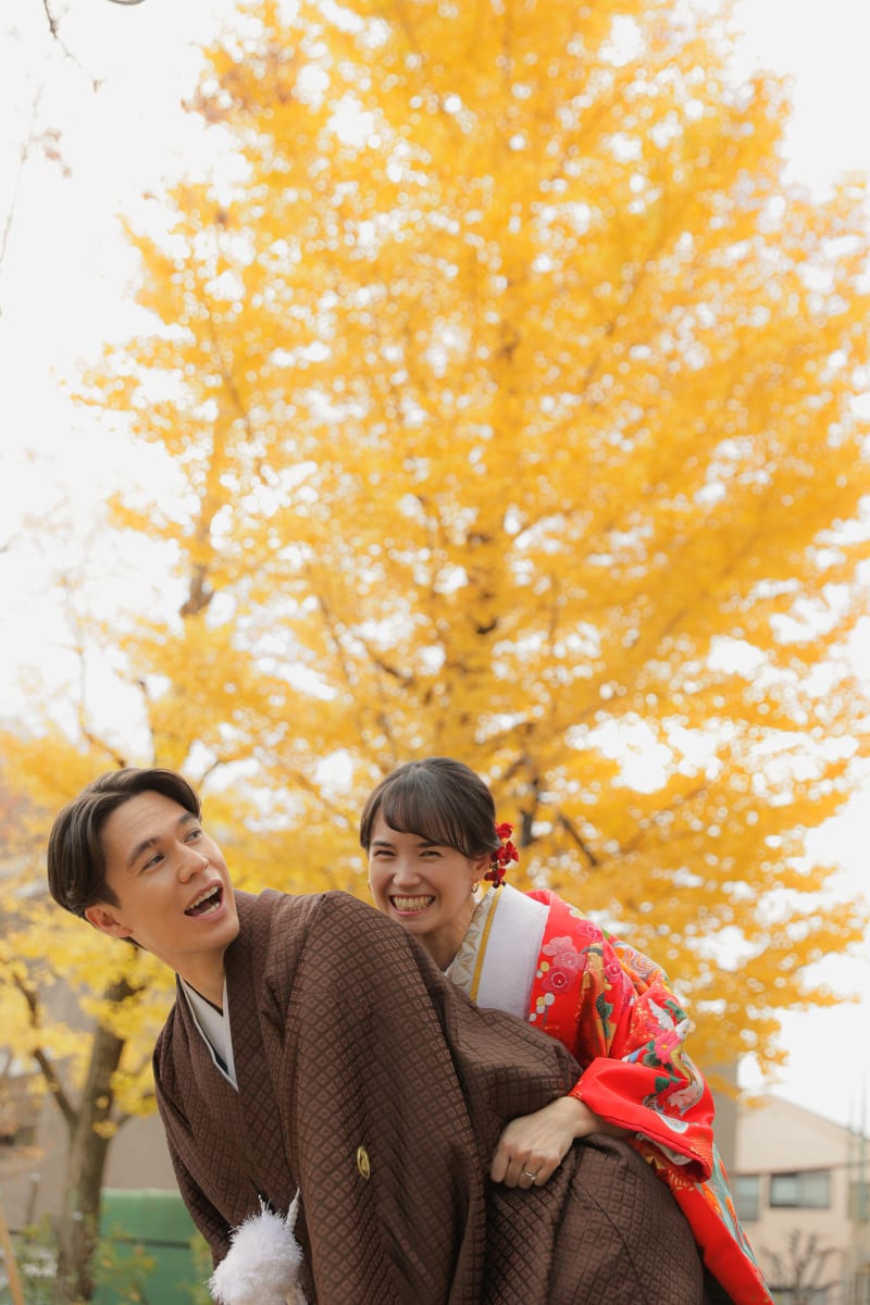 橙色の葉もまた鮮やかに色づき、おふたりの笑顔をさらに引き立ててくれました。