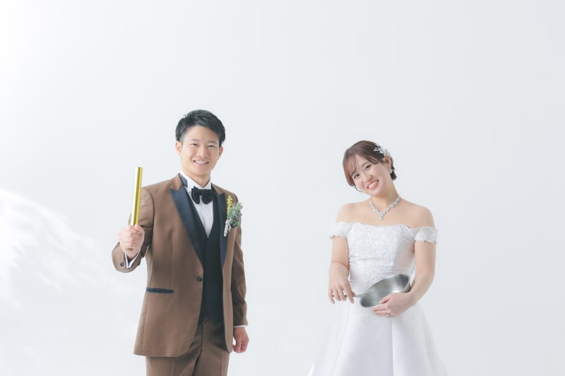 お菓子作りが好きなご新婦様はボールとホイッパーを、陸上競技をやっていたご新郎様はリレーのバトンを持ってきていただきました◎