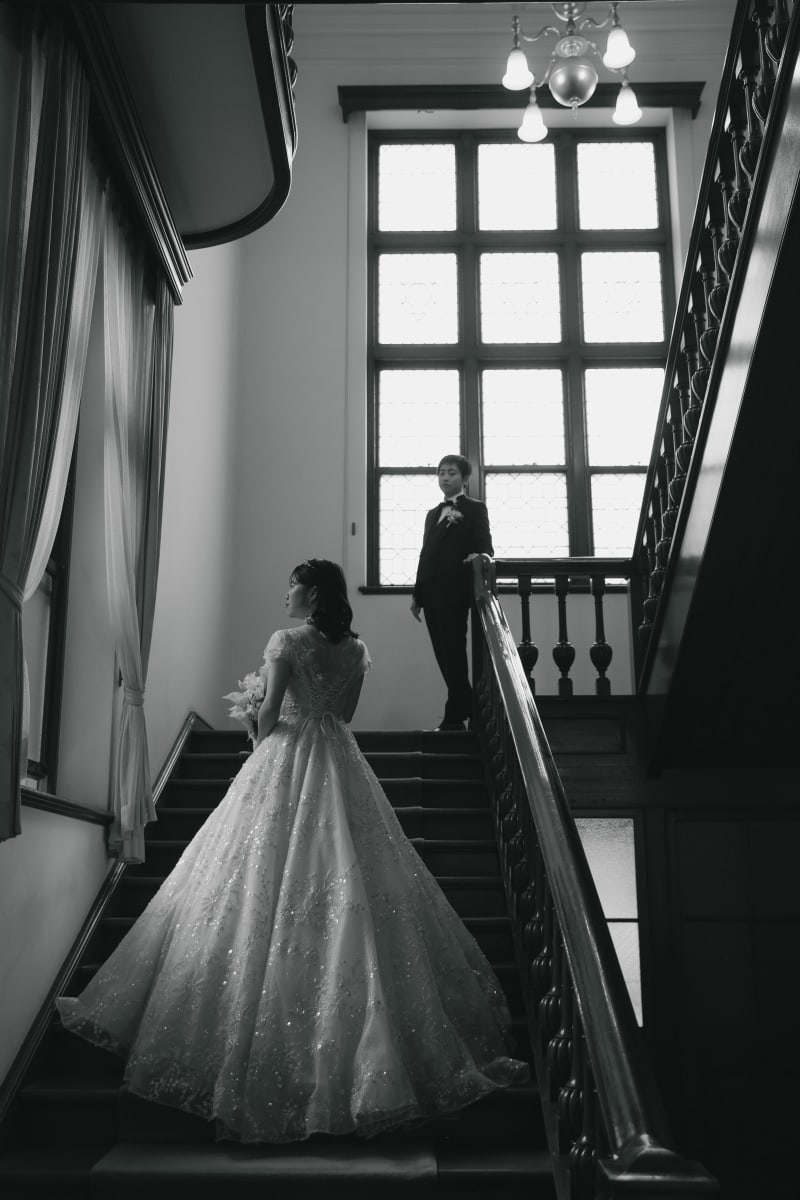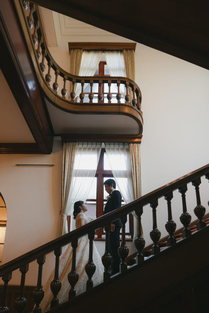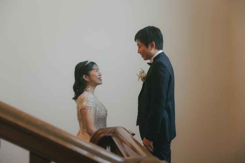 階段では上から新郎さんが降りてきて、二人が出会うシーンで。