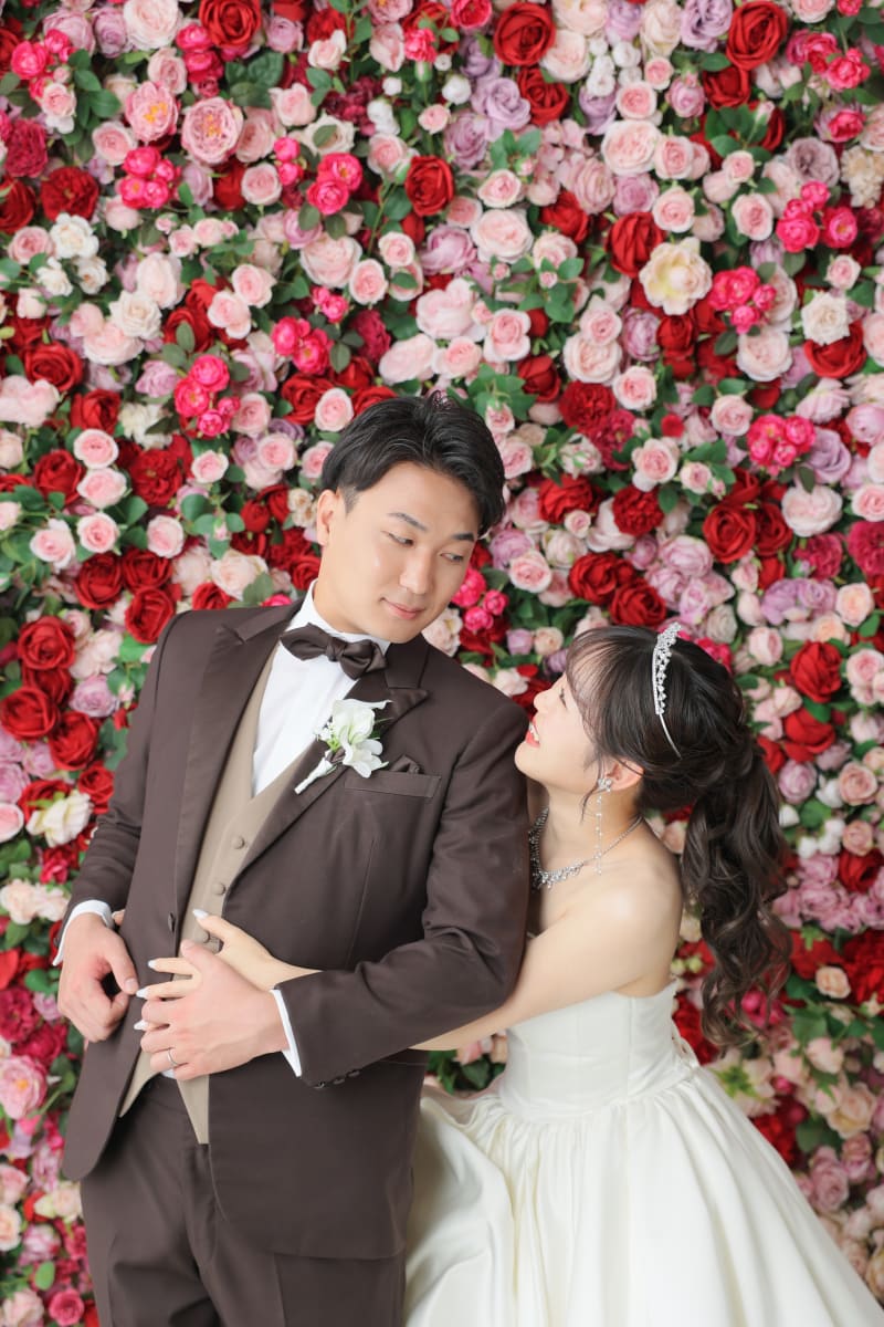 続いて薔薇の背景では、新婦様からの愛情溢れるバックハグで、新郎様の嬉しそうなお顔が印象的でした。