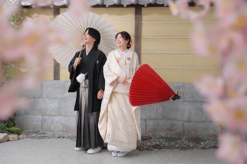 まずは、屋内庭園で和傘を使いました。 桜のピンクは柔らかい雰囲気にぴったりです!