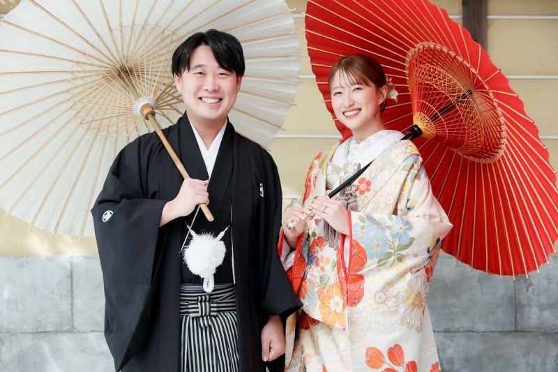 お二人で和傘をお持ちいただきました。着物のアクセントになっている赤と和傘の相性が素敵です。