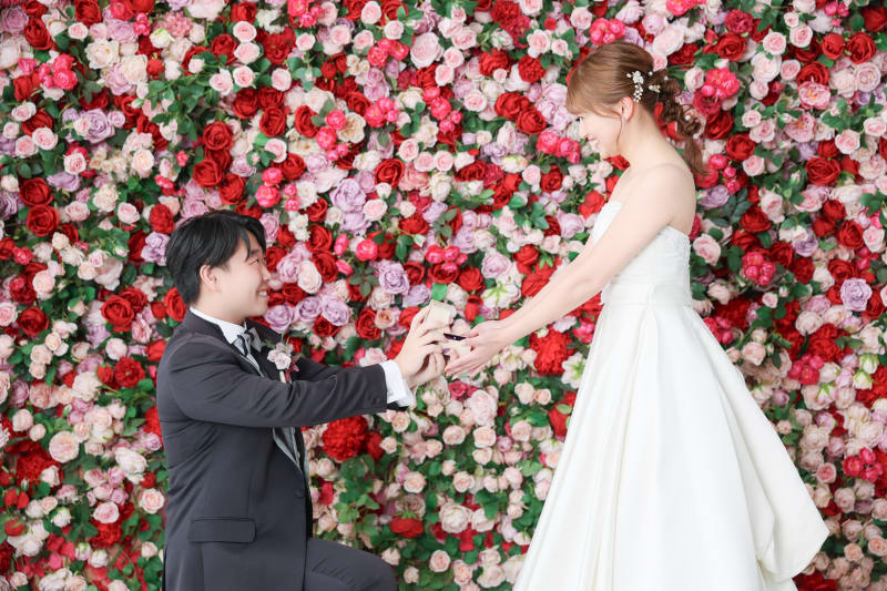 バラの背景でプロポーズをしていただきました。少し照れたお二人の空気感が素敵です。