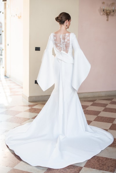 やわらかく広がる袖のデザインと、背中で結ばれたリボンが、クラシックな佇まいの中に女性らしい余韻を残します。