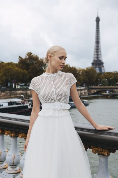 繊細なレースが肌に溶け込むトップスと、ウエストをやさしく引き締めるベルトが描くコントラスト。