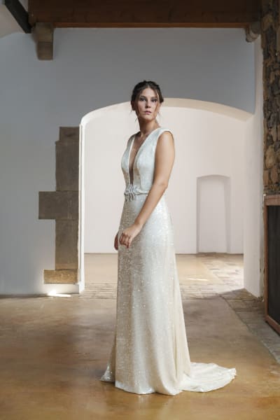 縦に流れるスパンコール刺繍が、身体のラインに寄り添いながら控えめでいて確かな輝きを生み出します。