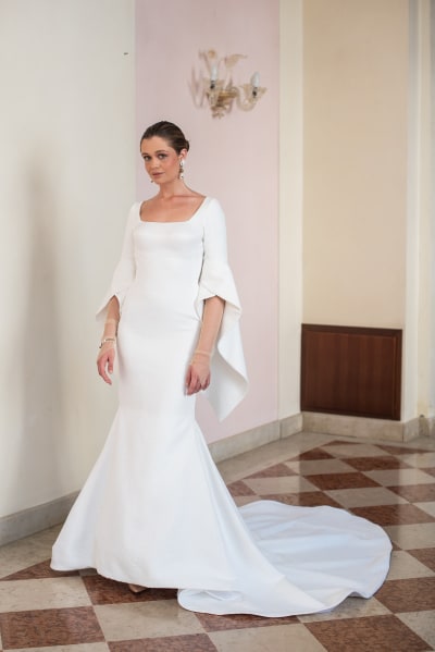 スクエアネックのデコルテと、身体に沿って描かれる美しいライン。
