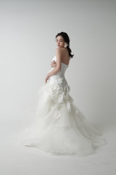 を生み出します。トレーンへと続く滑らかなラインが、後ろ姿まで美しく、写真映えする一着です。