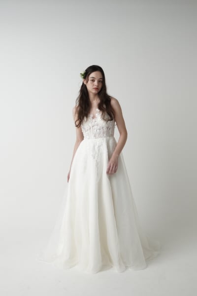 草花のモチーフを丁寧に刺繍した、繊細なレーストップスが印象的な一着。ナチュラルなボタニカル刺繍がデコルテから背中へとやさしく広がり、透明感のある女性らしさを演出します。スカートは軽やかなチュールを重ね、ふんわりとした動きを生み出すAラインシルエット。甘すぎず、控えめすぎない、上品でバランスの取れたデザインです。