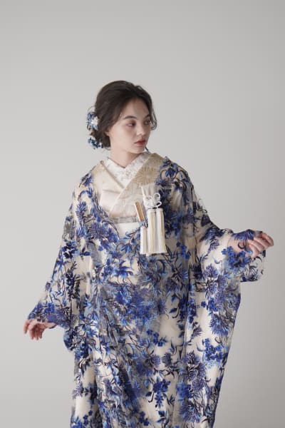 菊や桜など花柄が散りばめられ、繊細で女性らしさが映える正絹白無垢です。