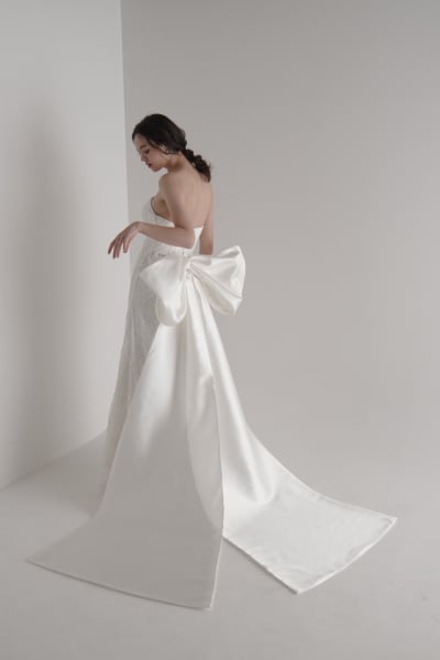 繊細なビーディングを贅沢にあしらった美しいマーメイドラインのドレス。ボディラインに沿う立体的な刺繍と煌めきが花嫁様の動きに合わせて上品に光を反射し、洗練された存在感を放ちます。バックスタイルには、大胆で印象的なビッグリボンを。