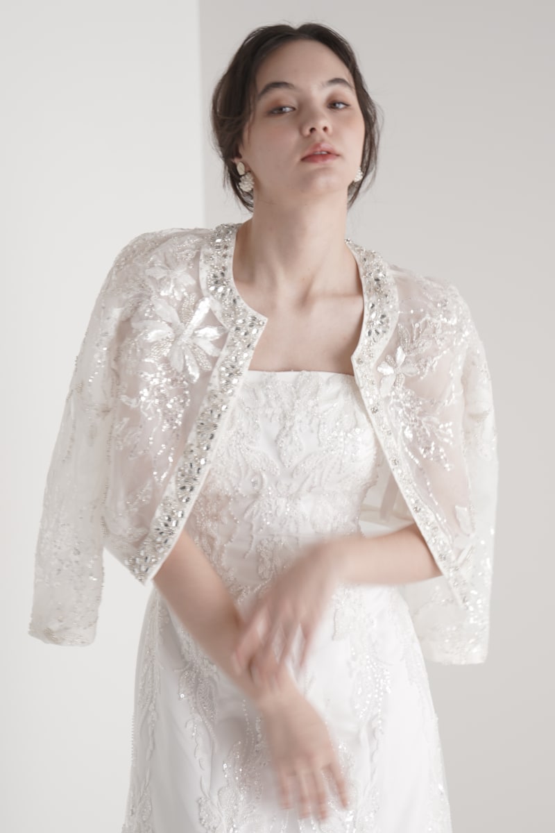 添えます。ドレスの美しさを引き立てながらもスタイリングにモダンなエッセンスをプラス。軽やかな透け感と程よい構築感が、クラシカルでありながら新しい花嫁像を演出します。
