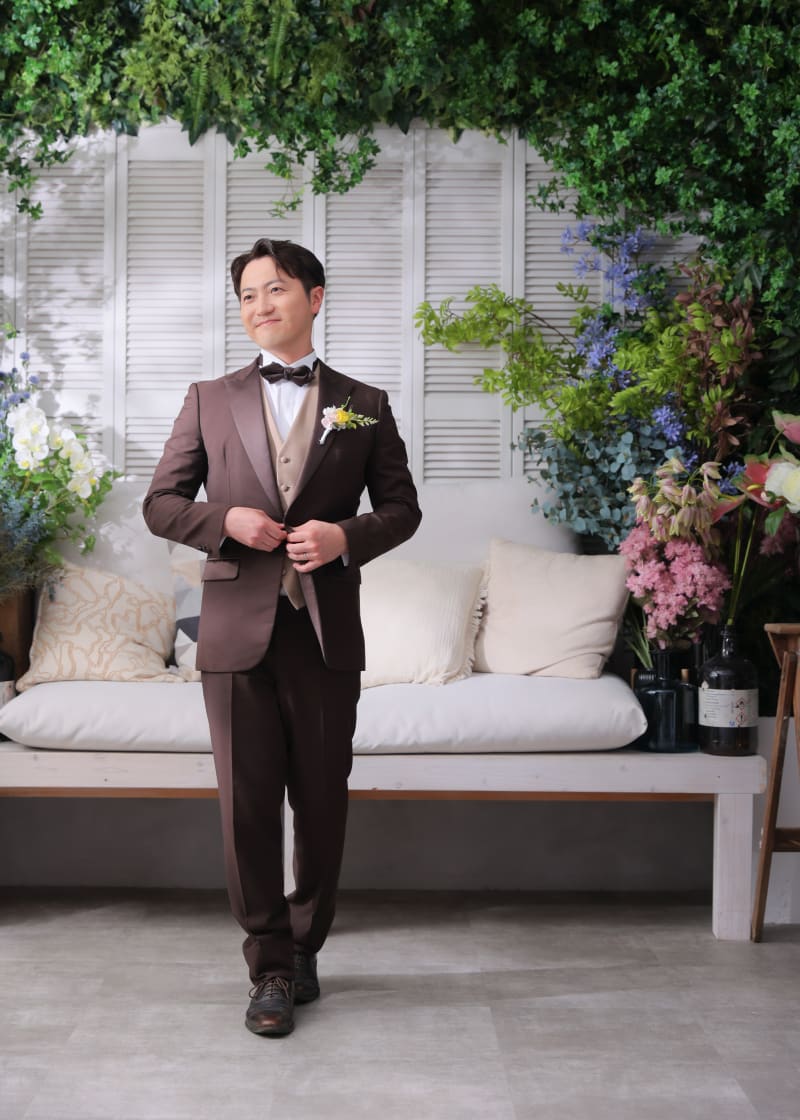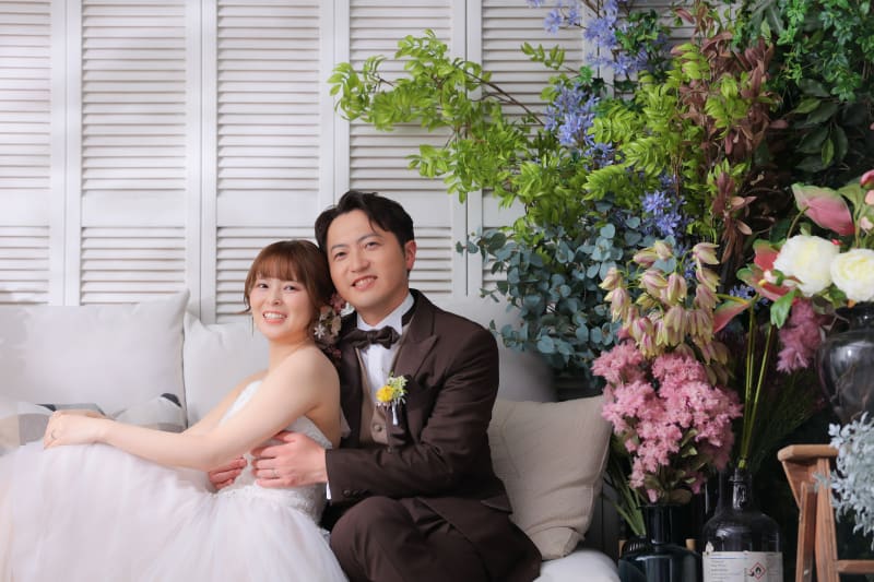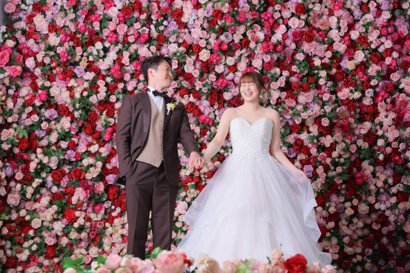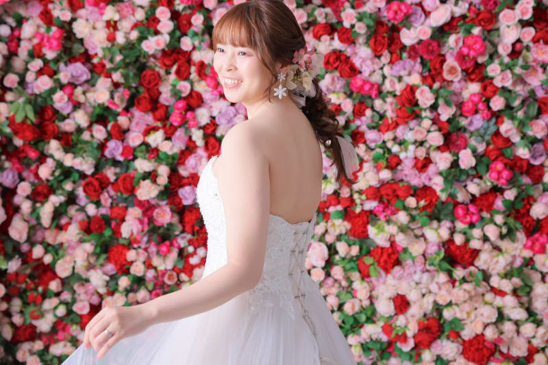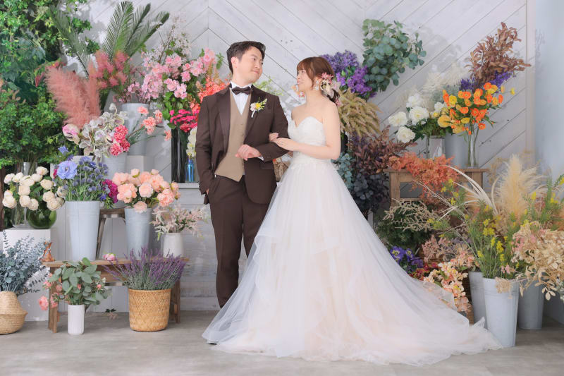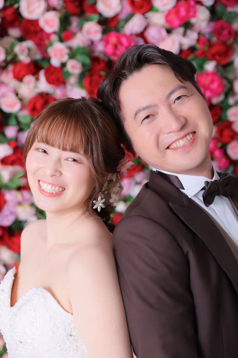 ご新婦様はかわいらしくバラ背景で、ご新郎様はナチュラルにボタニカル風背景で爽やかに撮影しました!