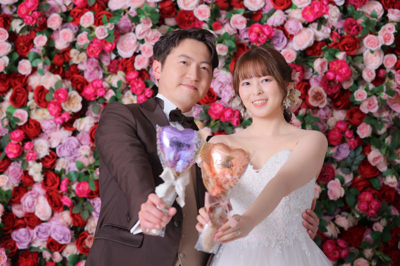 続いてはお持ち込みいただいたアイテムの撮影を。 Groom、Brideとそれぞれ書かれた小さなハートのバルーンをお持ち込みいただきました!
