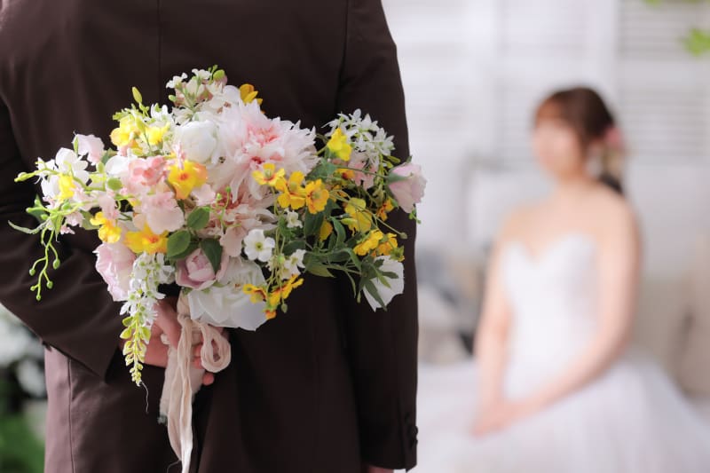 ご新郎様の視線の先にはご新婦様が、、サプライズ風にどんなものでも撮影できます!
