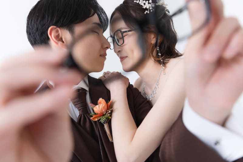 お二人の距離感をグッと近づけて。サングラス越しに切り取ることで、柔らかく奥行きのある一枚に。