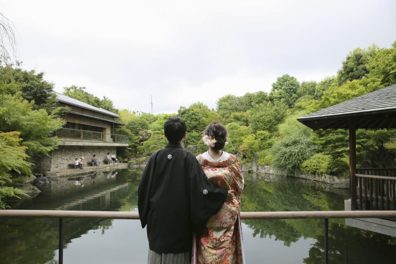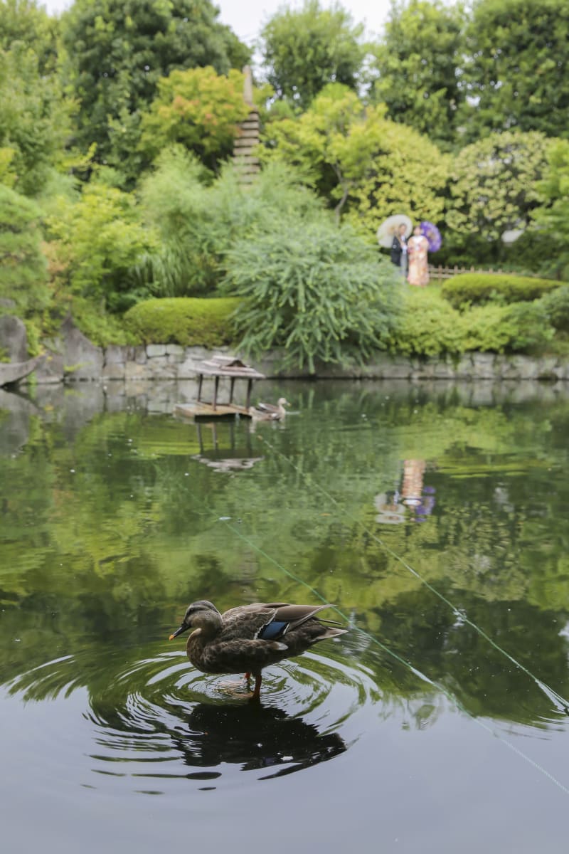 目白庭園の有名カモさんがお二人をお祝いしに近くまできますよ!