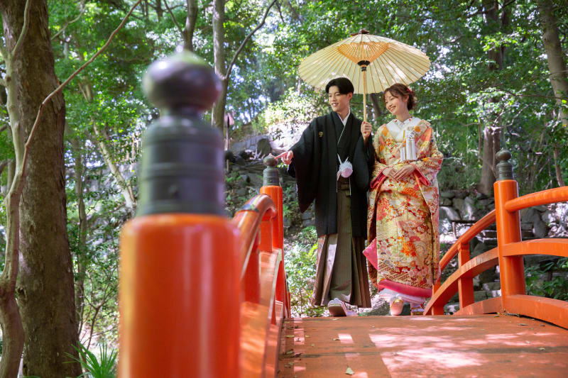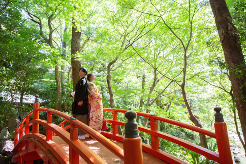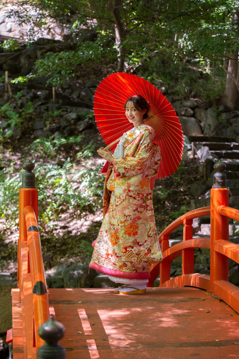 新婦様のソロショットもやはりこの橋の上で。和のティストが溢れています。
