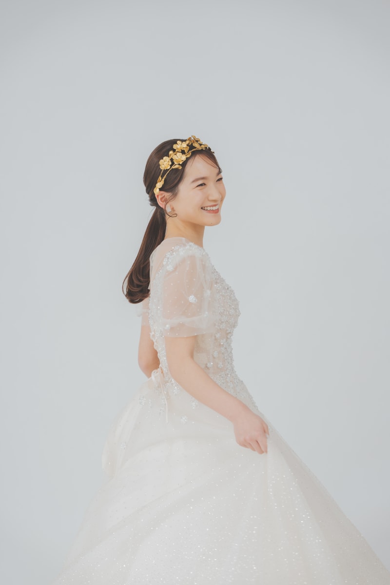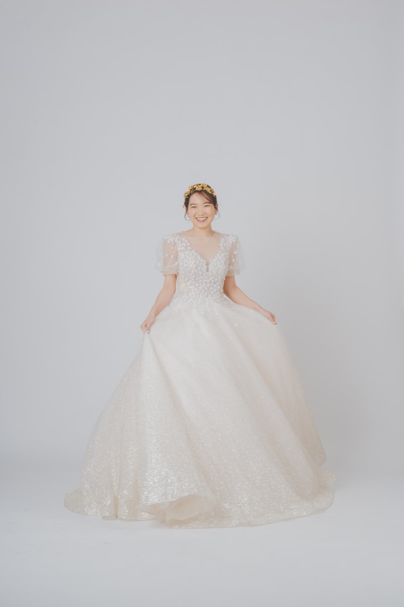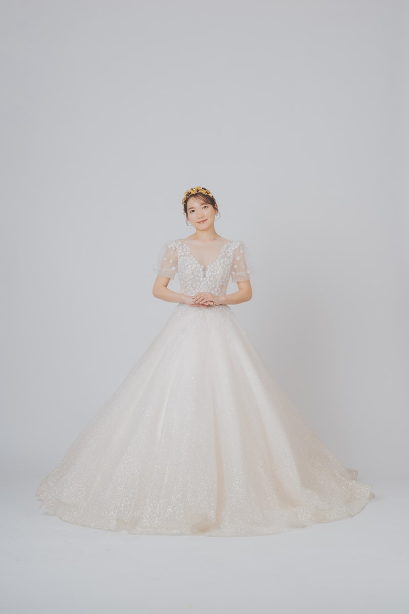 全体のシルエットとふんわりとしたパフスリーブの袖が女性らしく花嫁さんをより美しく見せてくれるドレスです。
