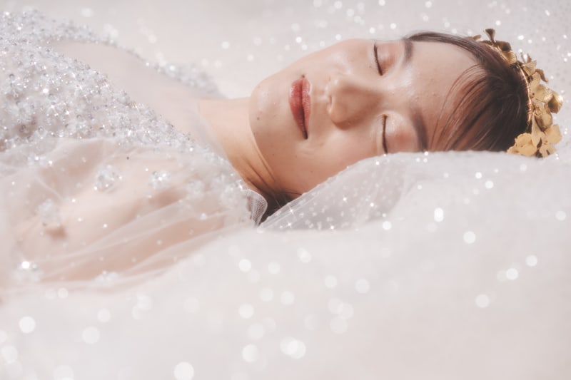 ここで寝転んだ写真もどうぞ!!きゃーーーーーーー!これはキラキラさとレースの繊細さに包まれていて何とも白雪姫が眠ってるかのような一枚です!