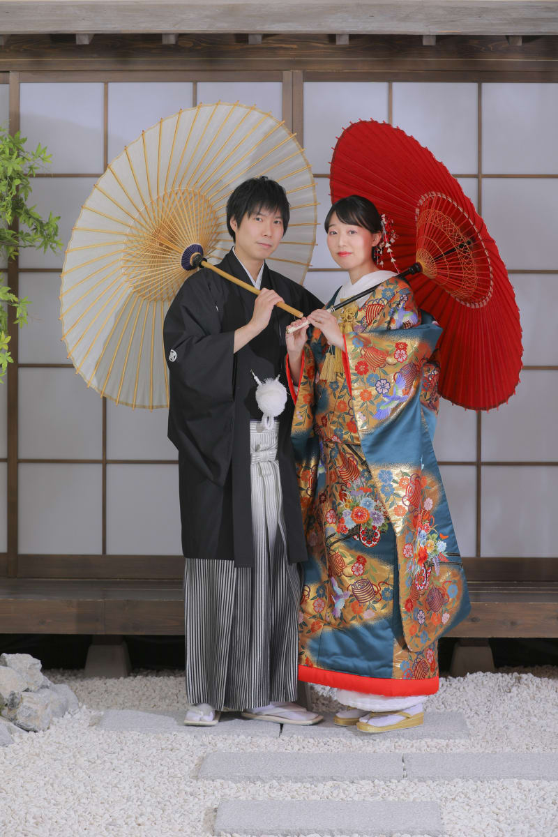 縁側のショットでは、お二人それぞれ和傘を持っていただきました!