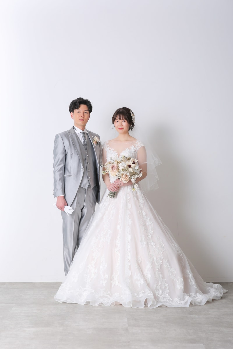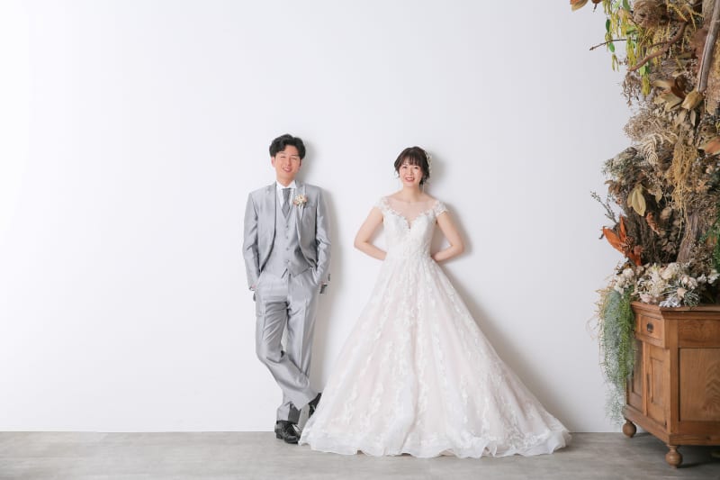 かっちりとっした写真の後はカジュアルなポーズを! 背景がシンプルな分よりお二人が引き立ちますね!
