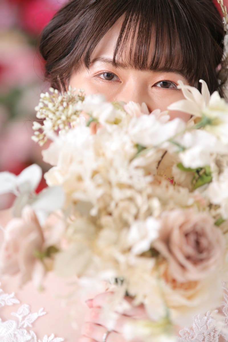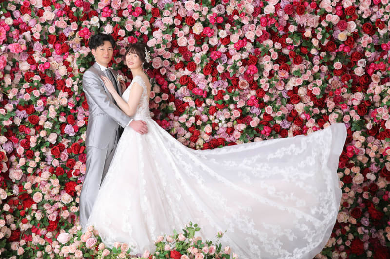 ドレスのトレーンが長いと裾が靡いている写真もよりダイナミックに! バラの背景でロマンチックに!