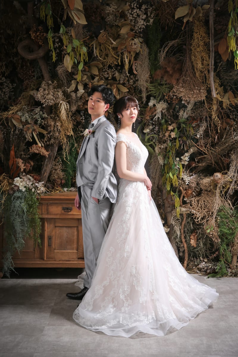 立ち姿はドレスのデザインもしっかり見えて素敵です。 ベールをつけて挙式のような写真に。
