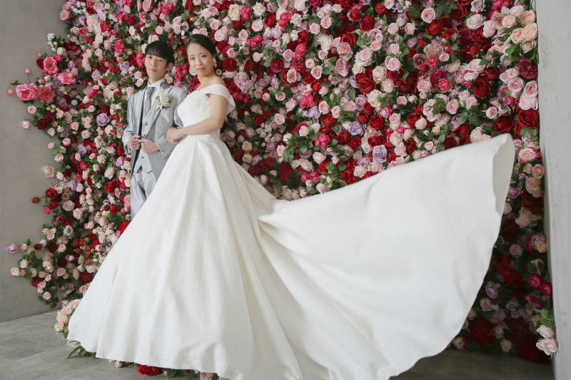 お花一面の背景にてドレスを靡かせながら華麗ながらも可愛いショットを撮ることができます!