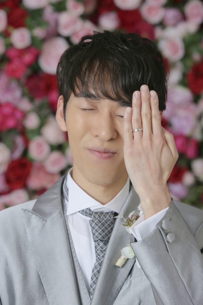 新郎様のタキシードとクシャッとした笑顔とお手元の指輪がとても素敵です!