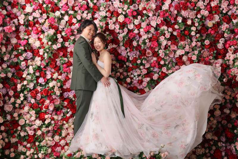 ご新婦様のカラードレスが風で靡いたかのようなふわっとお写真です!!